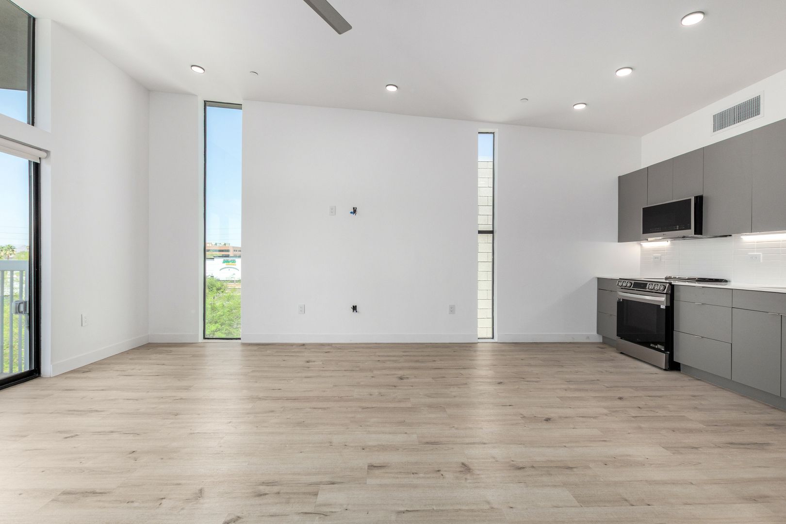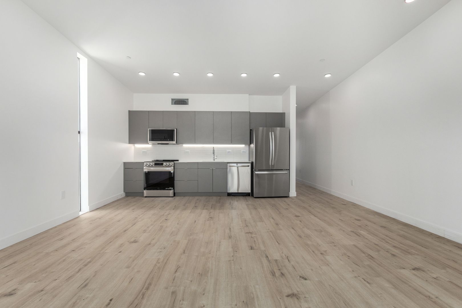 Enjoy a designer kitchen with dark gray flat-panel cabinets, white quartz countertops, sleek horizontal tile backsplash, and under-cabinet LED lighting. The kitchen is equipped with brand new stainless appliances, including a refrigerator with internal water and ice, and a built-in microwave.