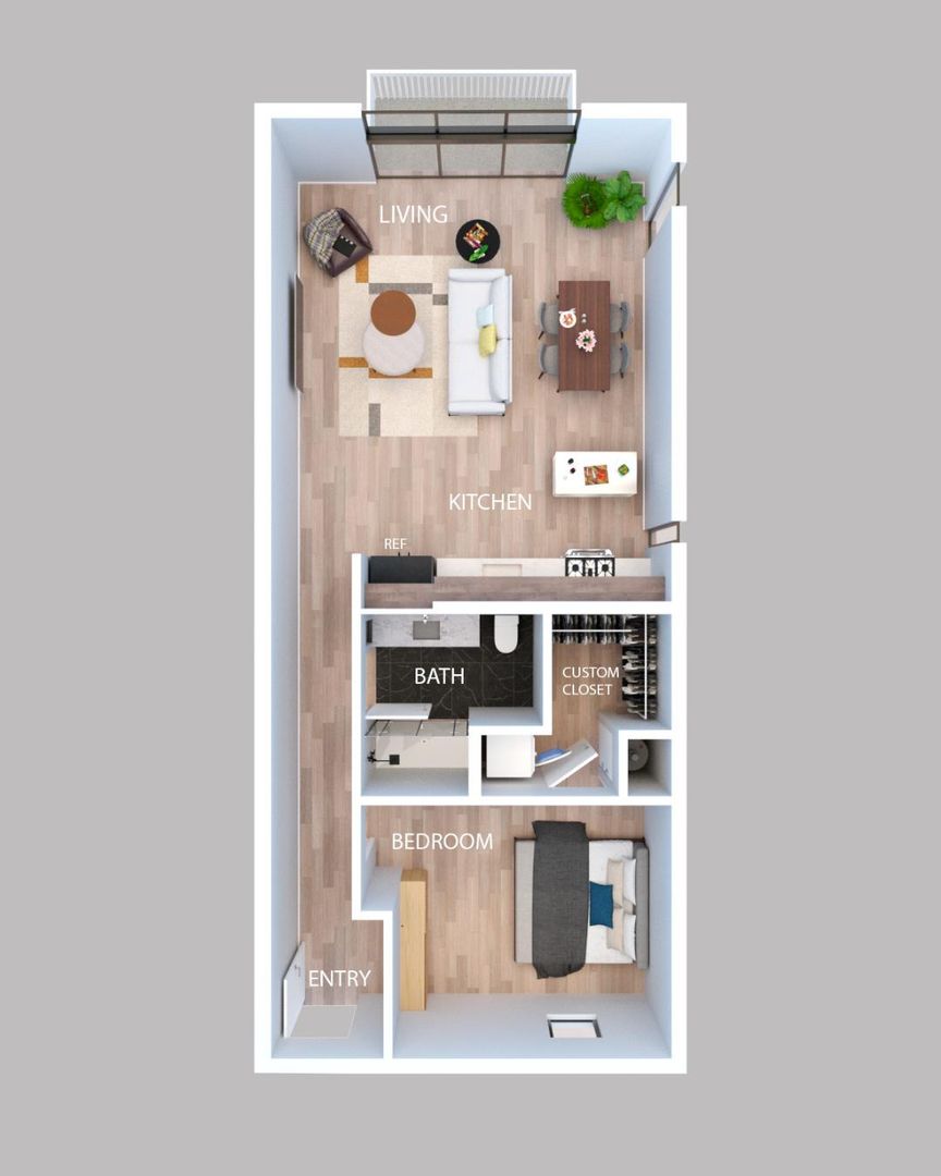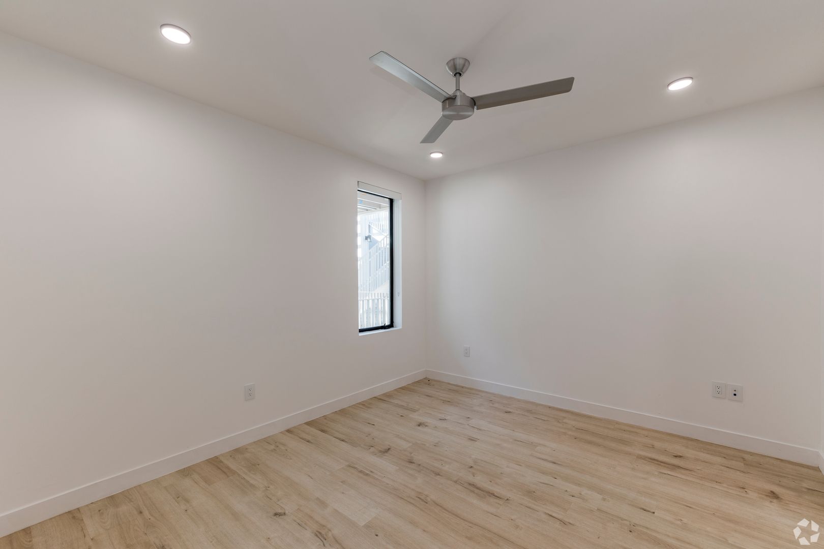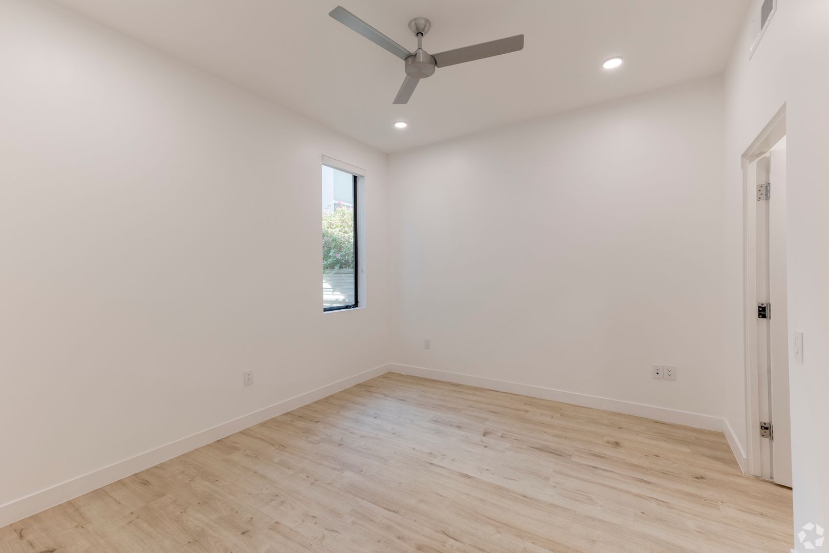 Relax in the spacious living area with modern lighting and ceiling fans in every room. The bathroom features an oversized vanity, slate-colored tile, and a walk-in shower for a spa-like feel. The unit also includes a large walk-in closet, in-unit washer/dryer, and a "floating" private balcony with great city views.