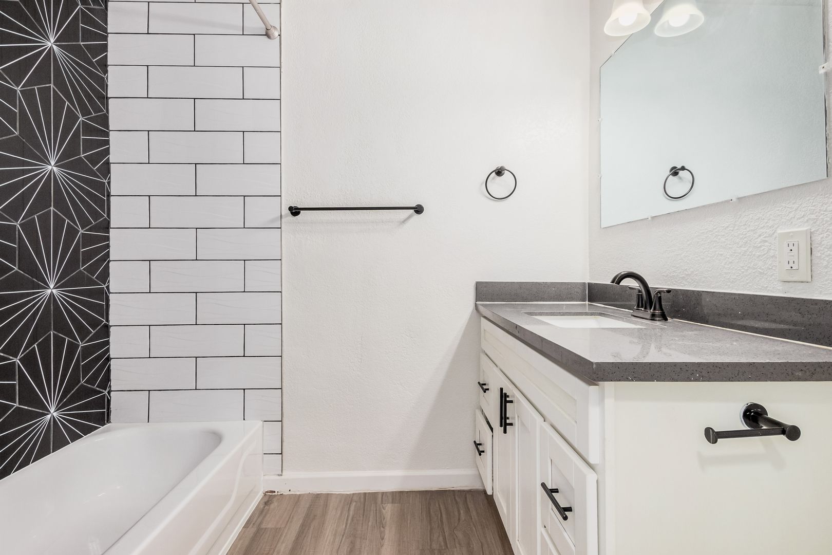 Tile and plank flooring through-out unit