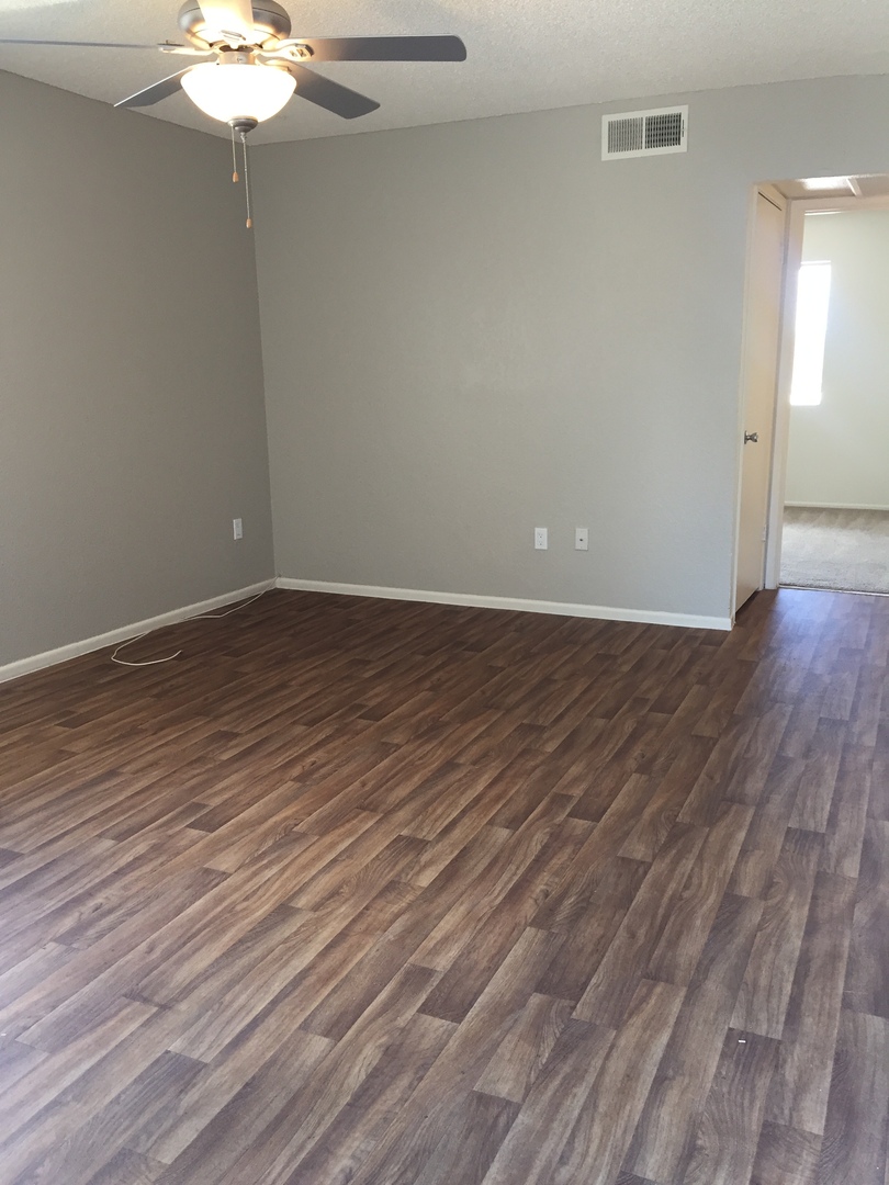 Faux hardwood and carpet flooring throughout