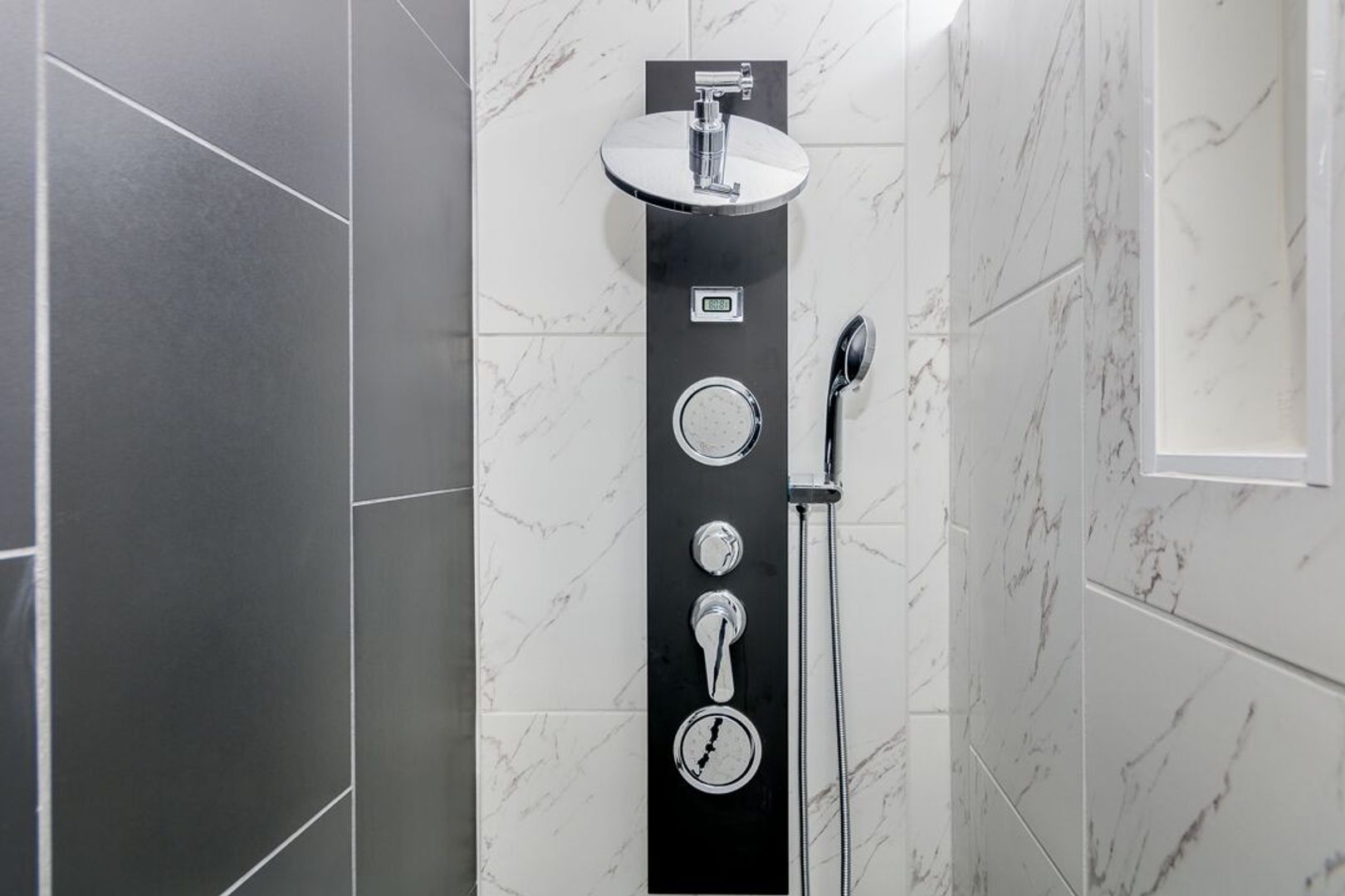 Walk-in shower with multiple jets & LCD temperature gauge